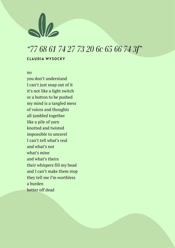 77 68 61 74 27 73 20 6c 65 66 74 3f — Claudia Wysocky